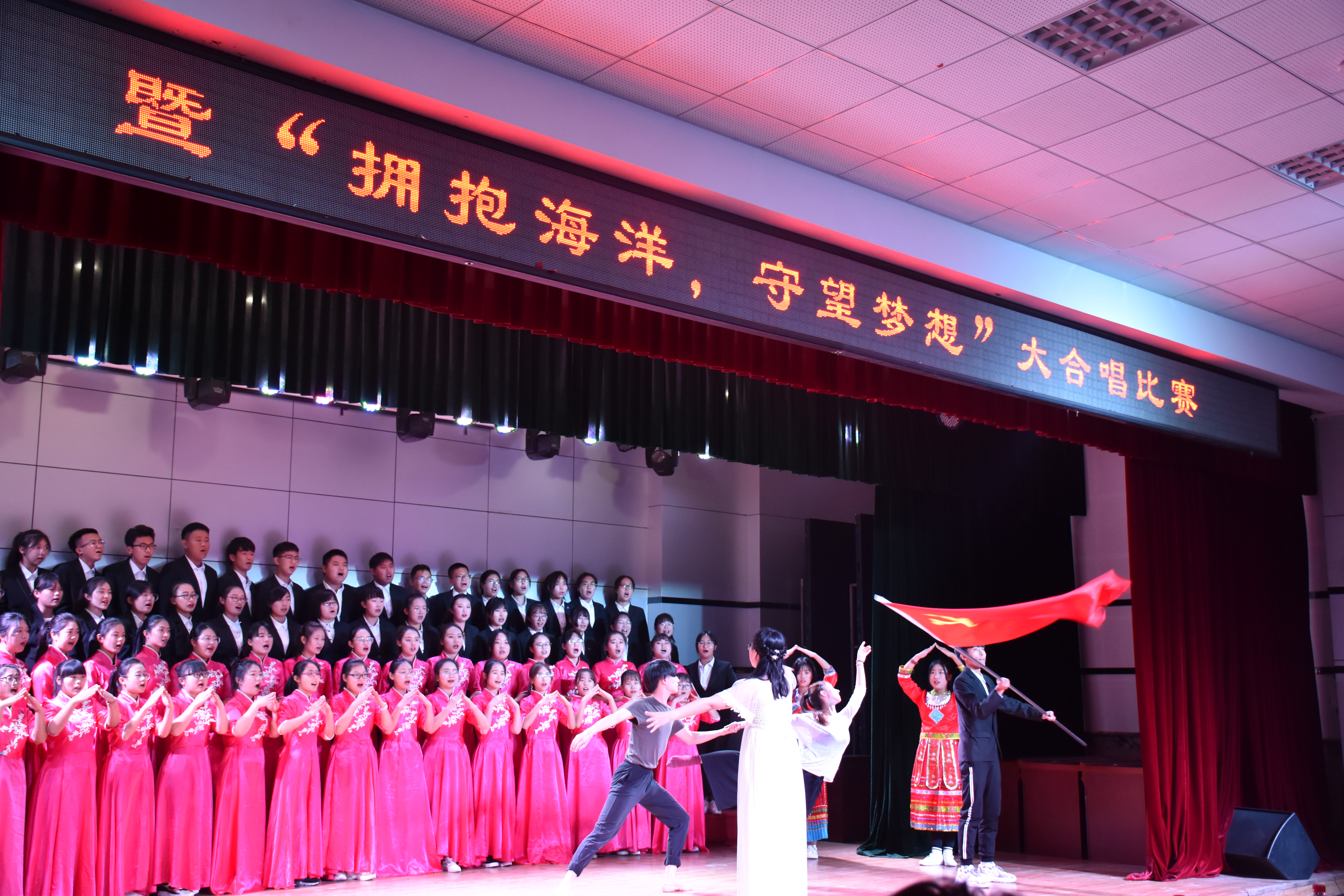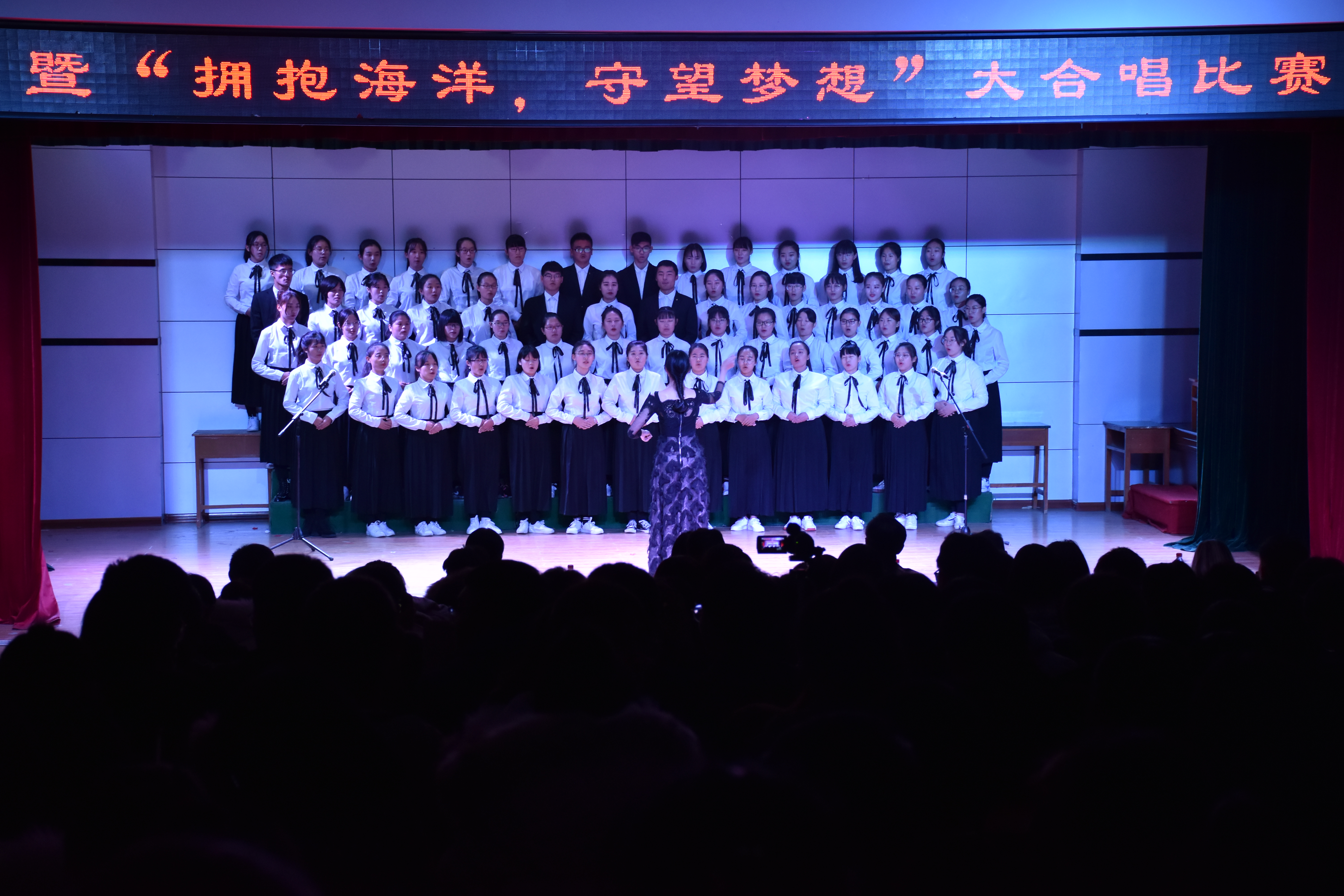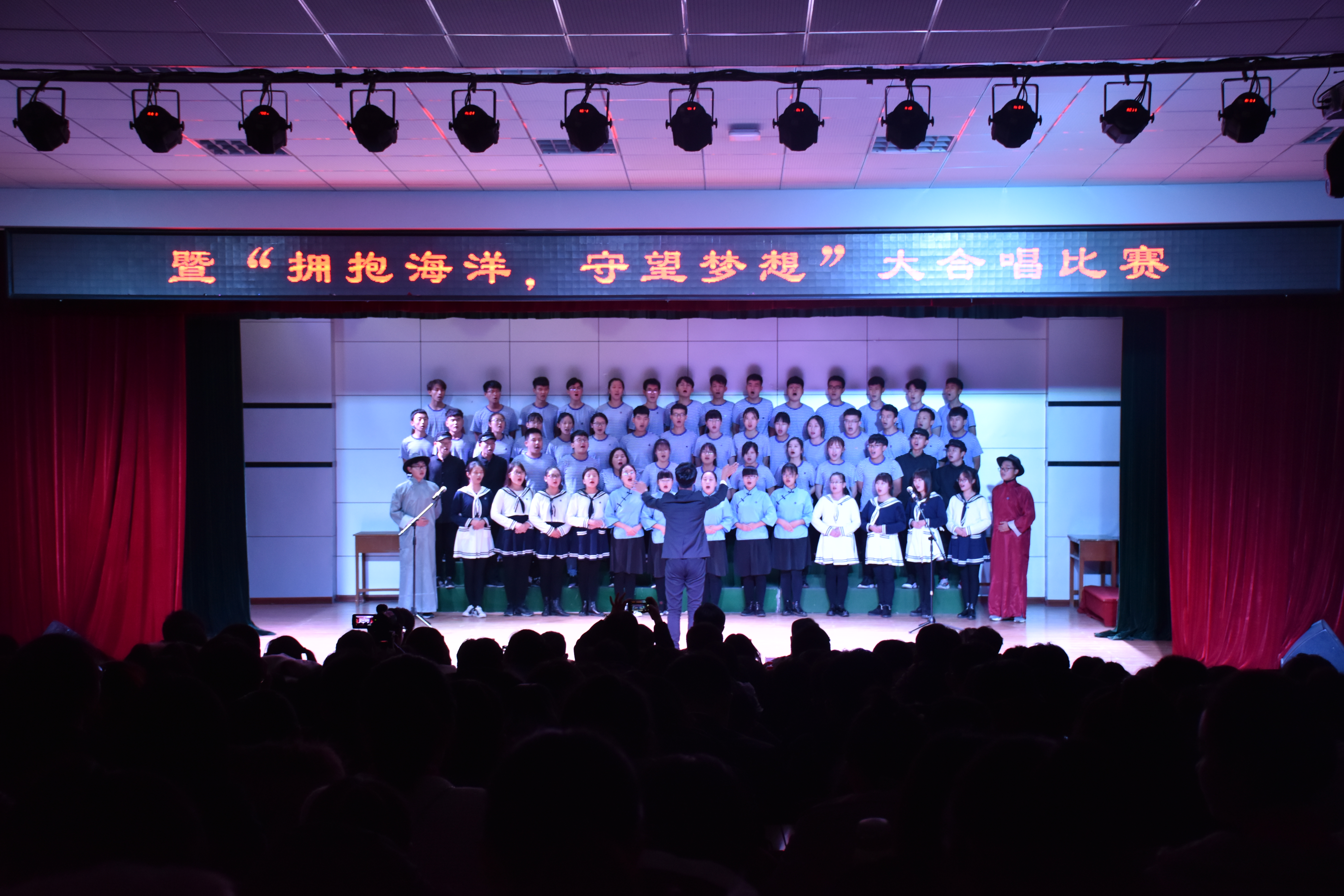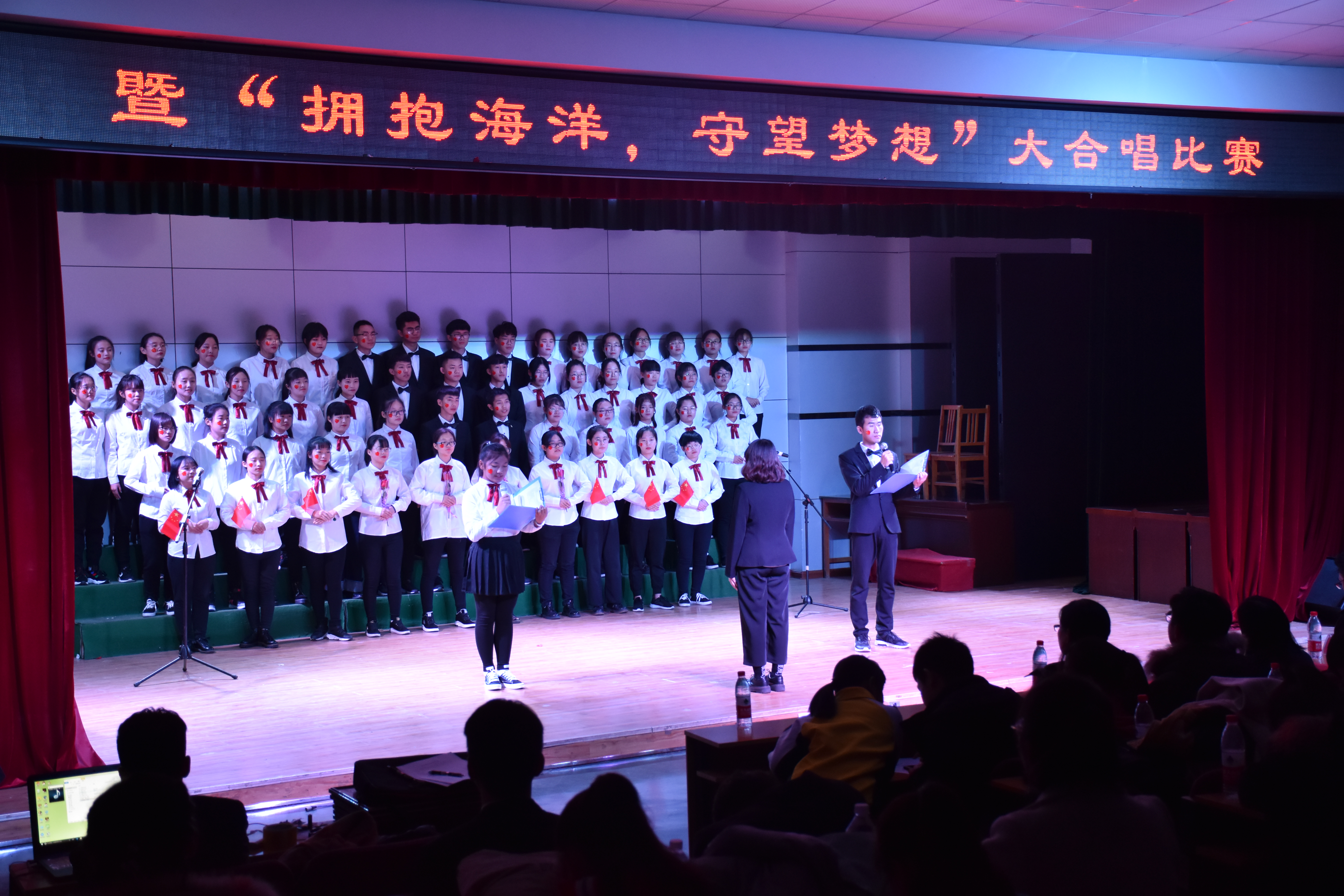 为了丰富大一学生的校园文化生活,弘扬爱国爱校精神,强化海洋意识,提高海洋观念,不断增强班级同学的凝聚力和集体荣誉感,促进引导大一新生尽快融入大学校园文化生活。数信学院于2018年11月15日晚,在秦皇岛校区多功能厅举办了数信学院第四届“爱国爱校 红歌嘹亮”暨“拥抱海洋,守望梦想”大合唱比赛。数信学院领导班子成员、学工办、分团委全体辅导员和2018级新生班主任及全体同学观看了本次比赛。