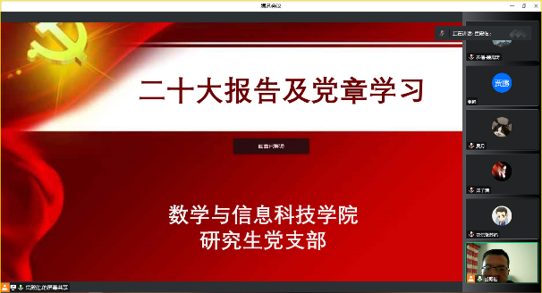 为深入学习宣传贯彻党的二十大精神,数信学院党委按照疫情防控要求,组织各支部召开线上党员大会,认真学习研读了党的二十大报告与《中国共产党章程》。对标对表《中共中央关于认真学习宣传贯彻党的二十大精神的决定》,按照上级党委要求,紧密结合实际,在全面学习、全面把握、全面落实上下功夫,不折不扣把党的二十大精神落到实处。本次学习教育活动成效显著,党员们收获良多。