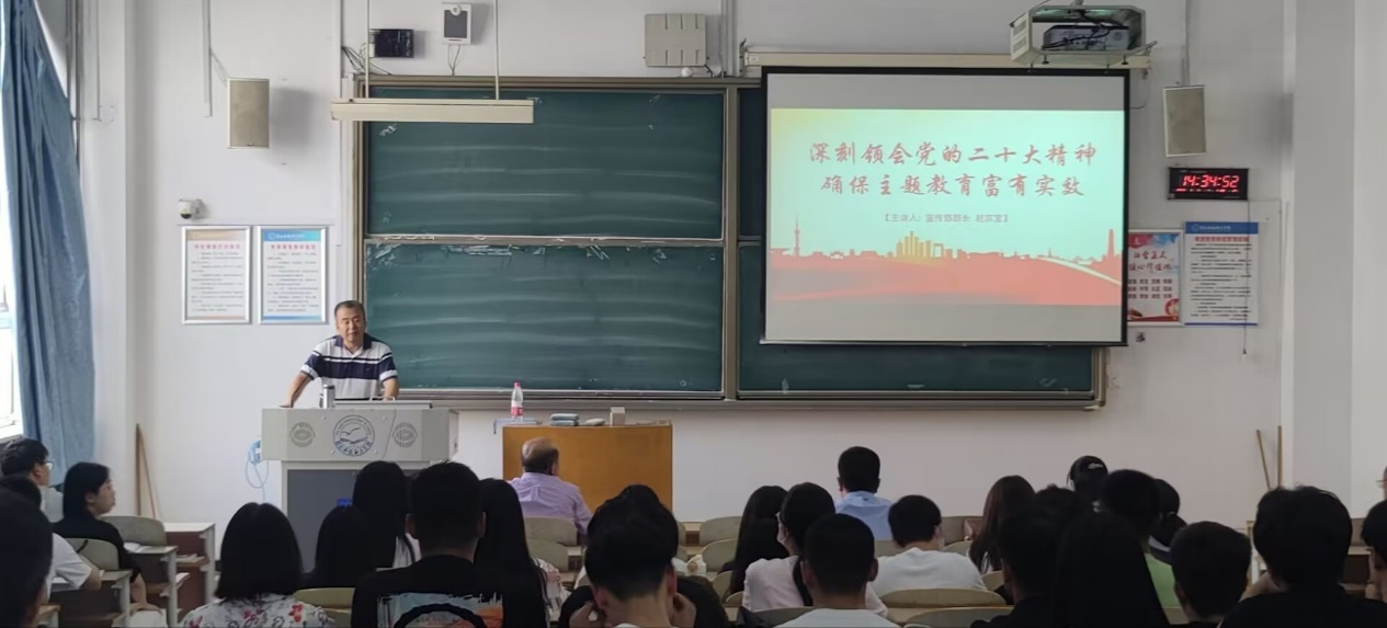 赵宗宝同志从学习贯彻党的二十大精神的重大意义、取得的重大成果,党的二十大86个字的主题,近十年、五年取得的重大成就,深入学习领会新时代中国特色社会主义思想涵盖的立场、观点和方法,深刻学习中国式现代化的科学概念和丰富内涵等九个方面深刻解读了党的二十大精神。整场报告,内容丰富,内涵深刻,反响热烈。最后他呼吁广大党员干部要坚持以习近平新时代中国特色社会主义思想为指导,深入学习领会党的二十大精神,不断推进主题教育走深走实,入脑入心,立足本职岗位,坚定理想信念,为学校的改革发展贡献力量。