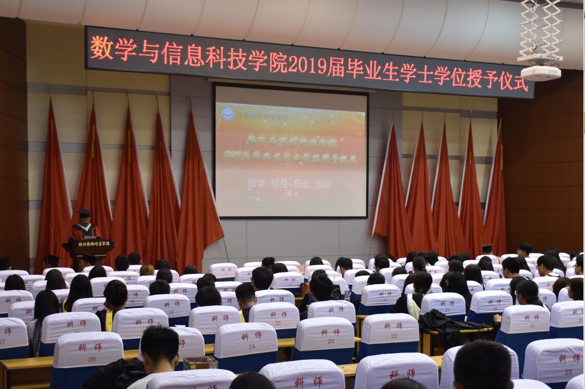 此次授予仪式在庄严的《国歌》和亲切的校歌《科技师院人之歌》声中拉开帷幕。此后,数信学院院长申玉发老师深情寄语毕业生,代表学院对圆满完成学业的同学表示热烈祝贺和深情祝愿,感谢毕业生将最美的年华留在数信,将勤勉、欢乐、青春和朝气播洒在学院每个角落,使数信更具活力,让数信更添魅力。同时,对全体毕业生提出三点殷切期望:一是不忘初心,在青春岁月里,给理想多一点时间,给精神多一些空间,做社会上精神最富足、力量最强大的一群人;二是牢记青年人的使命,做“中国的脊梁”,做真正对社会有意义的人;三是砥砺前行,要脚踏实地、持之以恒、奋发有为。随后,毕业生代表杨怡同学发言,表达了学生即将毕业的激动心情和对学校的感恩情怀,表示一定铭记校训,将科师精神发扬光大。