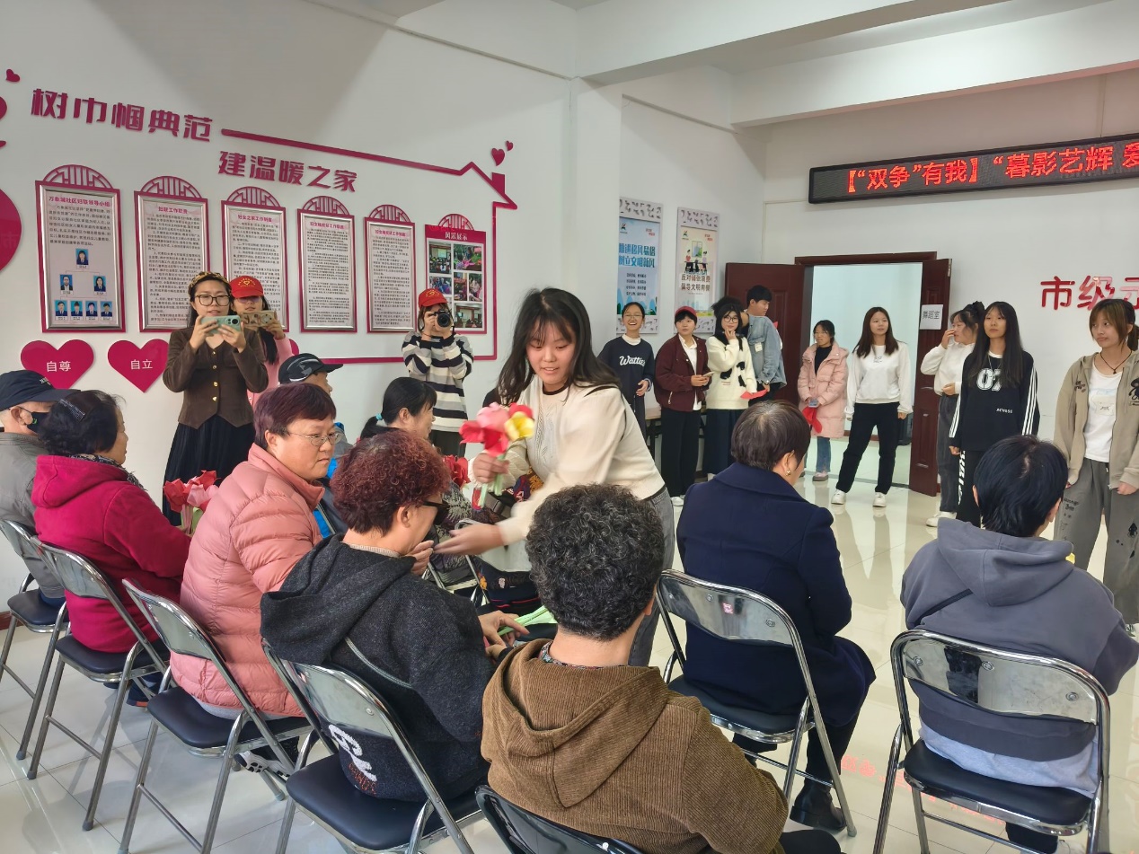 活动伊始,志愿者为老人们送上自己提前制作的手工花朵以表尊敬、关爱之情;接下来,又献上了精彩的才艺表演。活动过程中,同学们或活力满满地载歌载舞,或爱意满满地演唱乐曲,或在诗朗诵的一字一句中真情流露出关爱与温暖,或以幽默生动的小品向老人传递欢乐。随着《外婆桥》音乐的响起,老人们脸上绽放出幸福的笑容,现场氛围温馨而感人。最后,志愿者们用镜头记录了老人们幸福瞬间,伴随着相机快门键的声音,老人们最美好的瞬间被定格在了照片中。