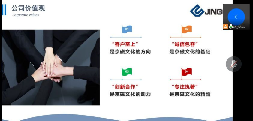 招聘会上,宣讲人通过ppt对企业的基本情况以及招聘岗位的主要职责进行了详细介绍。京磁材料科技股份有限公司成立于2003年,是目前中国最大的、领先的烧结钕铁硼永磁材料生厂家之一。公司为应届生制定了“摇篮计划”、“孵化计划”、“破壳计划”、“成长计划”四个阶段的培养计划,让应届生能够快速稳定地成长和发展,同时也会进行定期考核,并有专门的创业团队与完善的研发体系,为应届毕业生们提供了良好的就业平台。京磁材料科技股份公司每年都会组织一些文艺汇演与团建,福利待遇丰厚。