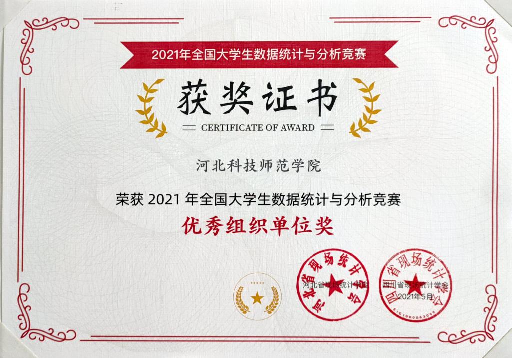 近日,2021年全国大学生数据统计与分析竞赛奖项揭晓,我校应用统计学专业学生获得二等奖1项、三等奖6项的好成绩,并获优秀组织单位奖。