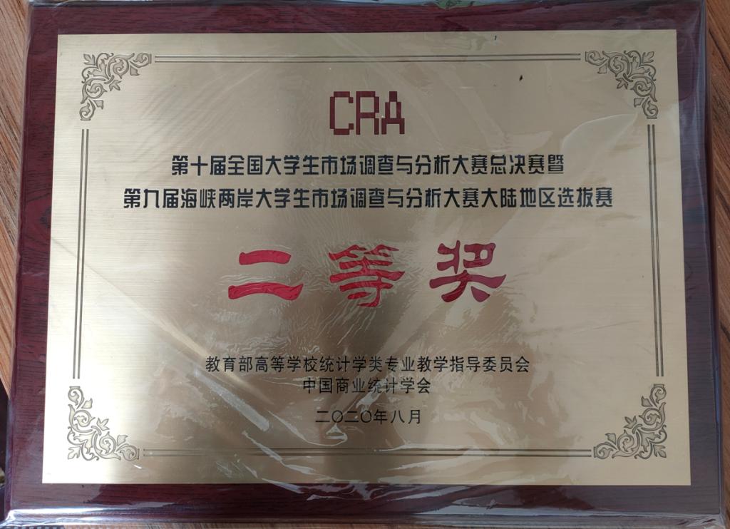 2020年8月3日至8月24日,在第十届全国大学生市场调查与分析大赛总决赛暨第九届海峡两岸大学生市场调查与分析大赛大陆地区总决赛中,由数信学院应用统计学专业王晓蕊、张莎莎、李朔颖、赵嘉星、许杭五名学生组成的“茶杯小分队”,在刘思严、常竞文、刘青三位老师的指导下,取得国家二等奖的佳绩,另有两参赛作品获得省级三等奖。